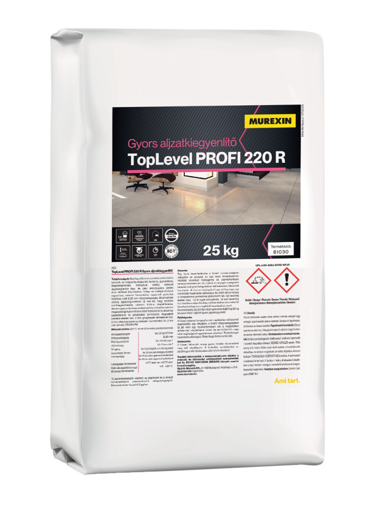 Keverési arány: kb. 5,5 liter víz (megfelel kb. 0,22 l/kg) 25 kg Murexin TopLevel PROFI 220 R Gyors aljzatkiegyenlítő